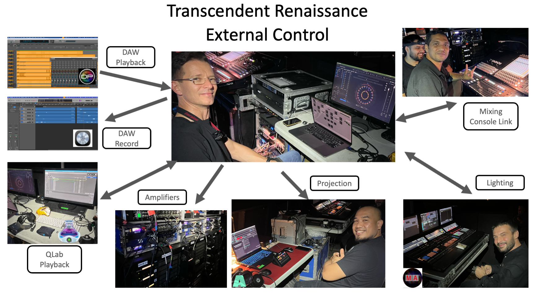 Brad was the sound designer for Transcendent Renaissance by Calin Topa, an immersive exploration of time and memory through sound, performance, and design. Focusing on sound, it blended multi-track choral recordings, music, and sounds with other elements and live performers to create a unified multi-sensory experience for the audience. Performed in the desert outside Dubai at a 4000 year old burial site, this work aligned perfectly with Brad's vision to bing the world together through sound. The sound team was comprised of individuals from eight different countries from around the world.